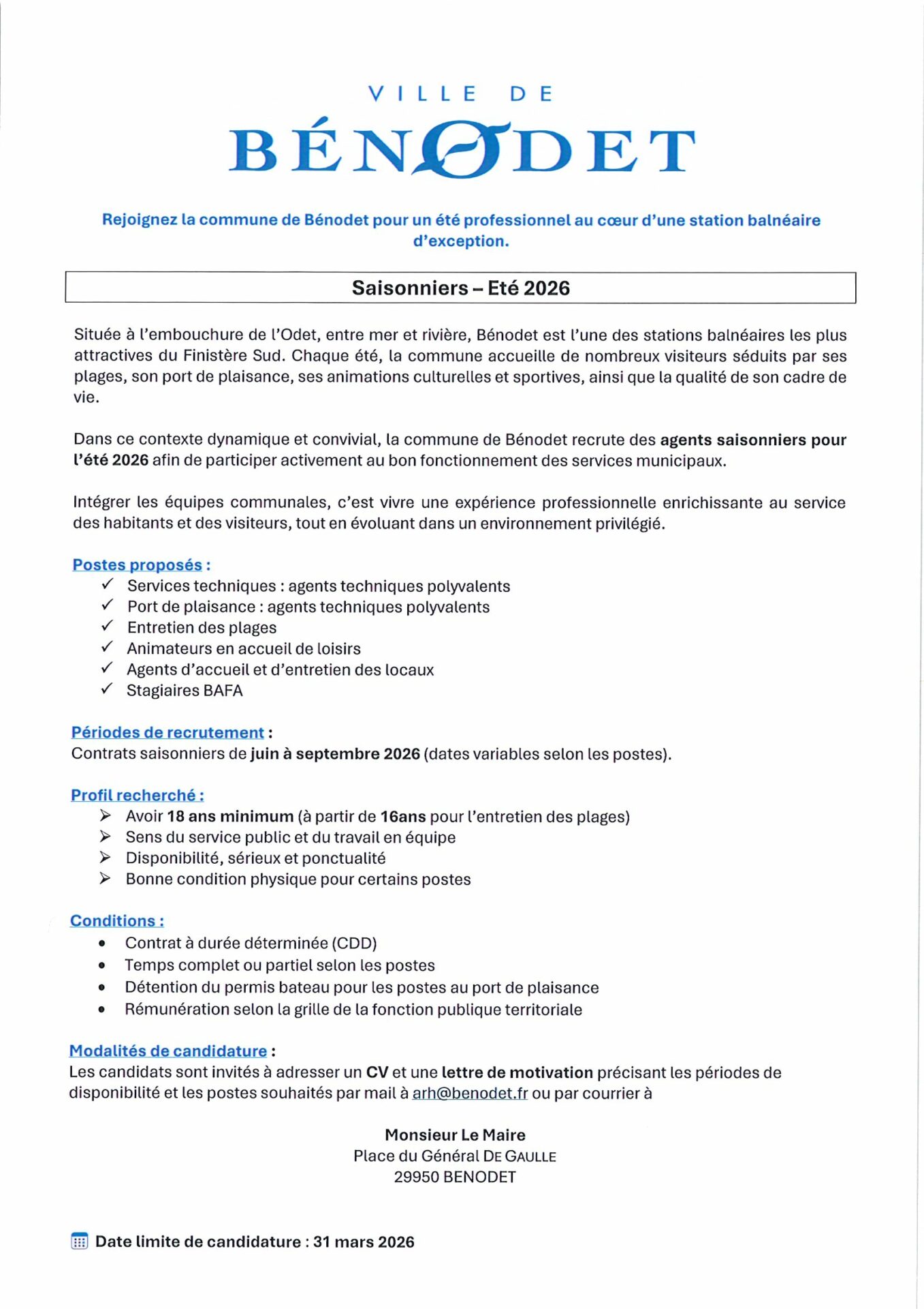 Durant la saison 2026, la ville de Bénodet propose plusieurs postes saisonniers au sein des différents services municipaux.